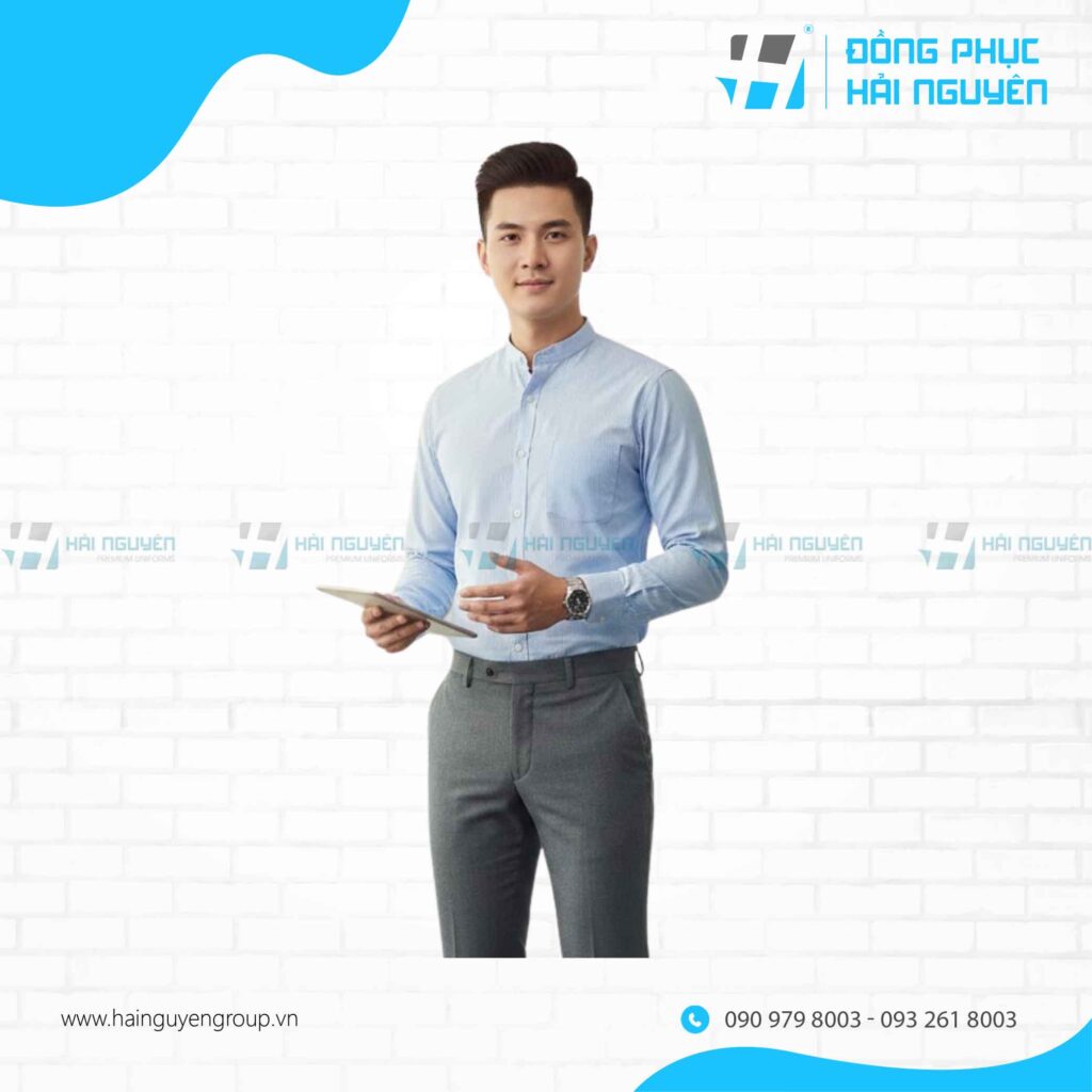 Bên cạnh những kiểu truyền thống, các mẫu áo sơ mi đồng phục công ty đẹp với thiết kế cổ trụ đang trở thành xu hướng mới trong những năm gần đây. Dáng cổ trụ mang lại nét hiện đại, trẻ trung và có phần phá cách. Rất phù hợp với các công ty công nghệ, dịch vụ hoặc ngành sáng tạo.
