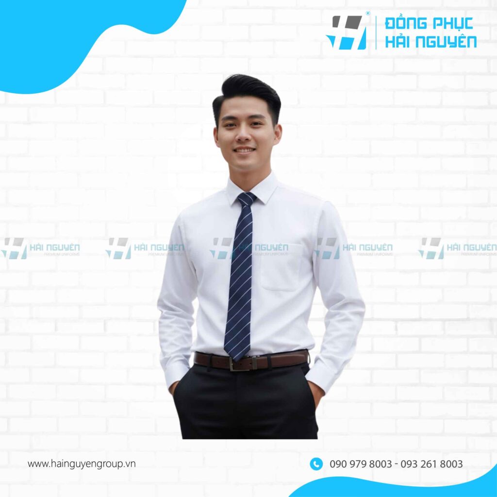 Đối với nhân viên nam, đồng phục công sở nam đẹp thường ưu tiên phong cách lịch sự. Phổ biến nhất là áo sơ mi công sở kết hợp cùng quần tây tối màu, form dáng vừa vặn. Sự kết hợp này giúp tạo cảm giác gọn gàng và nam tính.